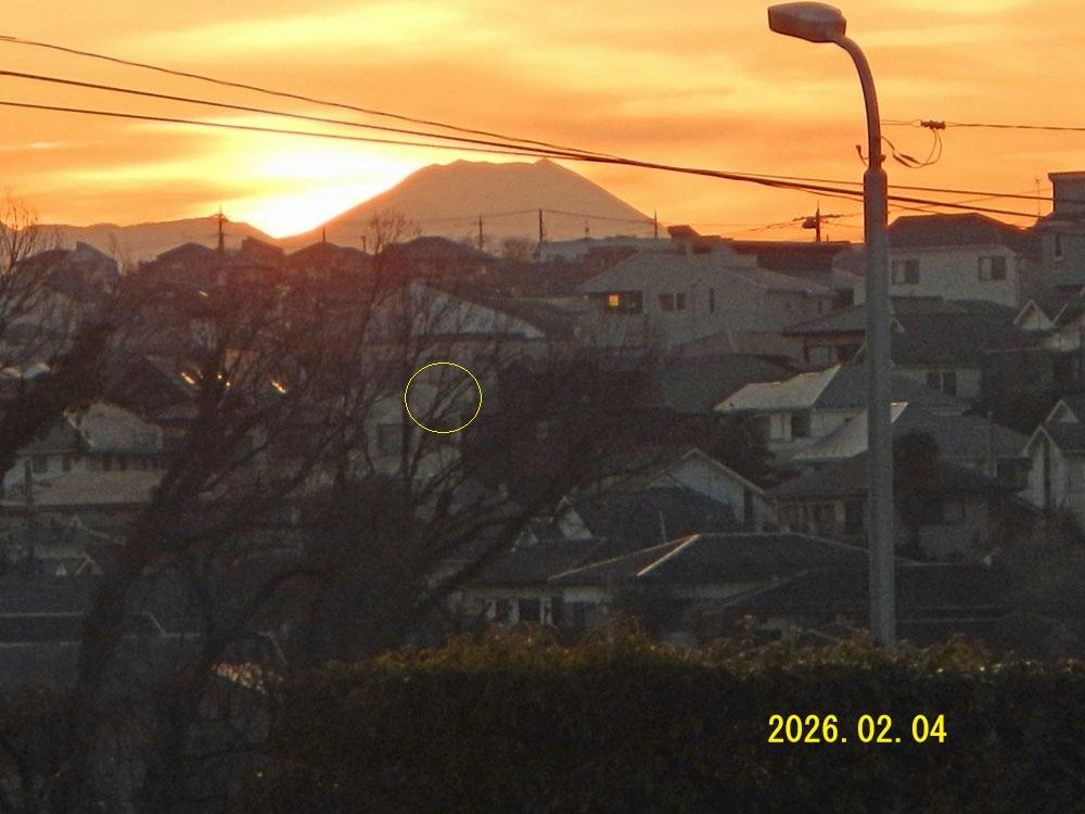 1月31日はマイホームダイヤモンドデー(勝手にそう呼んでいる)でしたが、2年連続で失敗。富士山の左右の斜面だけは見えるのに、山頂近くは雲の中で見えませんでした。翌2月1日(つまり今日)はよく晴れましたが、日没位置は山頂からズレてしまいました。