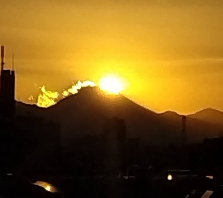 今年もマイホームダイヤモンドデーの11月10日がやってきました。(前にも言ってますが、正確にはマイホームじゃなくてUR団地です)今年はどうしても休みが取れず、まあ秋はめったに見られないからと高をくくっていたらよく晴れて、カミさんに写してもらいました。前にも思ったのですが、太陽がド真ん中に来るのは11日ではないかと言う気もして、今日も気にしていたのですが曇に阻まれました。過去の経験則からですが、なかなか11月には見えませんねぇ。