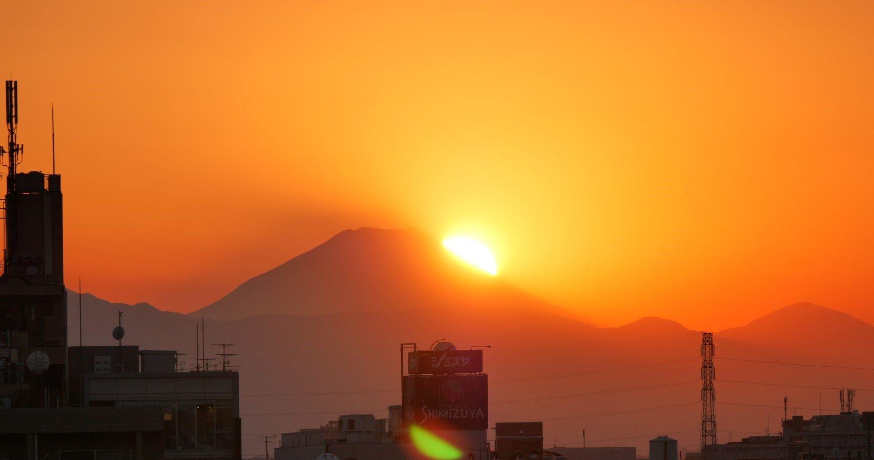 1月31日はマイホームダイヤモンドデー(勝手にそう呼んでいる)でしたが、2年連続で失敗。富士山の左右の斜面だけは見えるのに、山頂近くは雲の中で見えませんでした。翌2月1日(つまり今日)はよく晴れましたが、日没位置は山頂からズレてしまいました。
