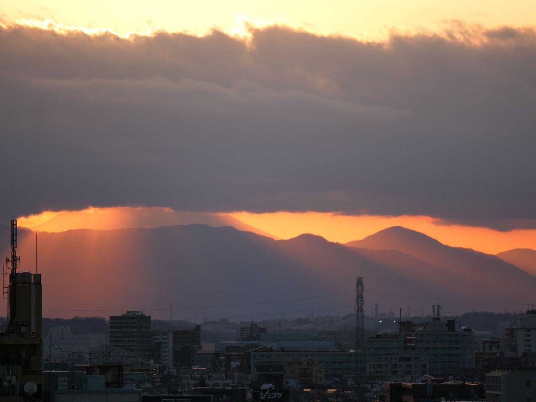 昨1月31日の日没と富士山。自宅団地の9階~10階の踊り場から。