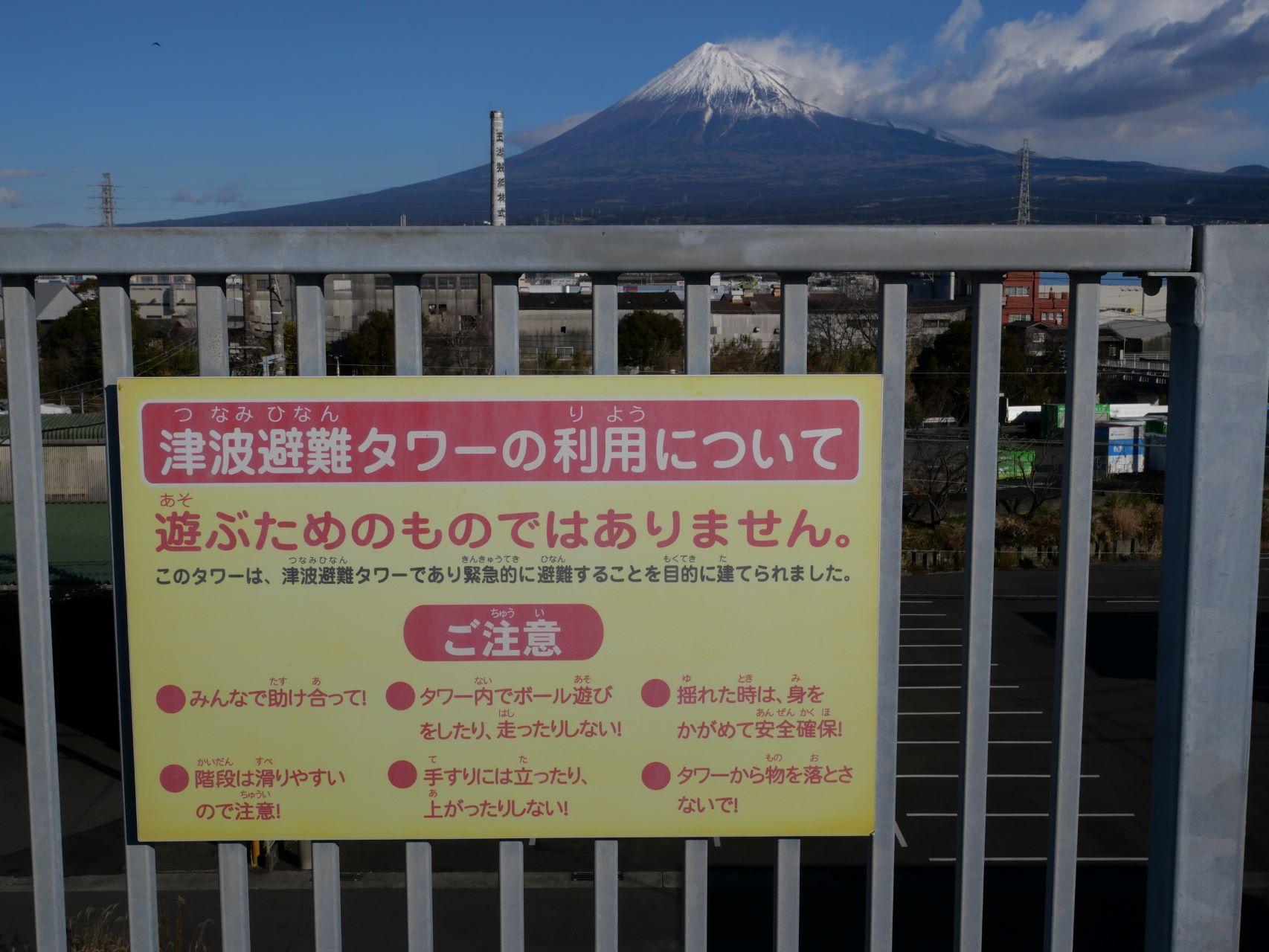 今日東海道線、吉原駅北側の、駅からほんの2~3分のところに「津波避難タワー」があるのを発見。言われてみればここも海のそばで、海抜わずか数メートル。東日本大震災のような大地震があればひとたまりもない事を改めて思い出しましたが、タワーには当然の事ながらカギはなく、自由に登れるようになっており「遊ぶためのものではありません」と大きく書いてあるのを気にしつつも、富士山がよく見えそうなので登ってみました。(富士山の写真を撮るのが「遊び」に入るかどうかは微妙ですが・・・)高さは10数メートルで、普通の建物の4階程度と思われましたが、富士山方向には遮るような建物もなく、荒々しい山肌が真近に見えました。他に登る人はなく、当然周囲から目立つのであまり長居はしませんでしたが、冨士見には良い場所でした。前述の通りカギをかけるわけにもゆかず、かと言って大勢が立ち入ったりすればイタズラや事故の心配もあり、難しいところですが、不慣れな人ばかりでは緊急時に困るし、平時にはあえて富士山の展望台として宣伝してみたらと、そんな気がしました。