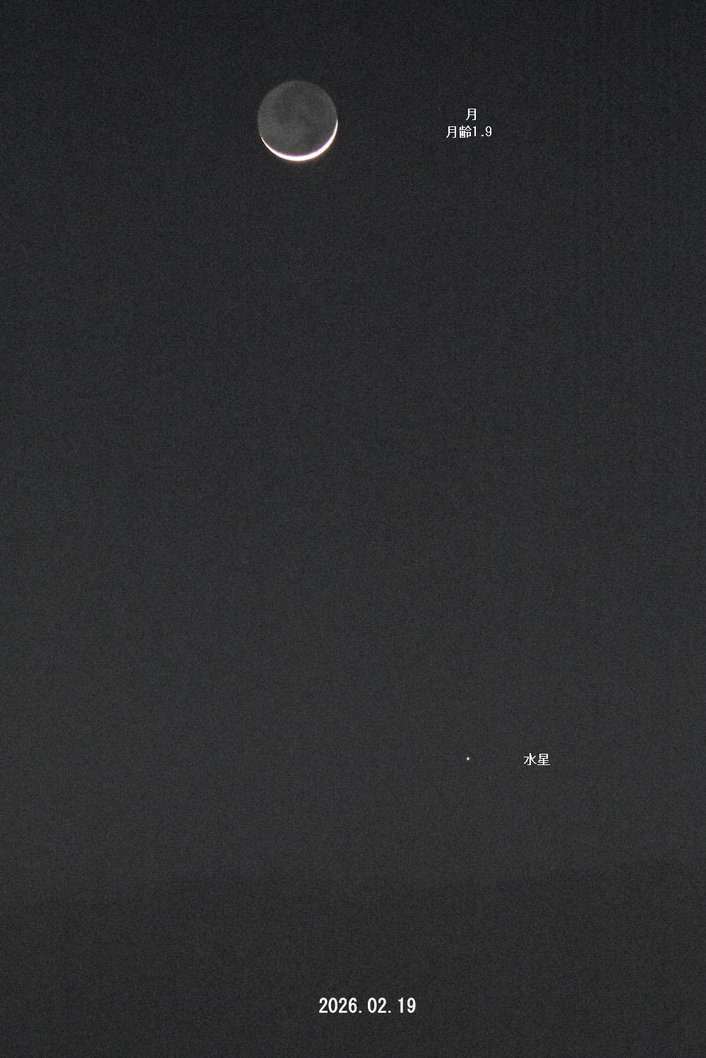 今回は月齢1.9の細い月が目印でしたのですぐ見つかりました。多摩区からですと大室山のちょっと右あたり。地平線に雲があり、山は見えませんでした。